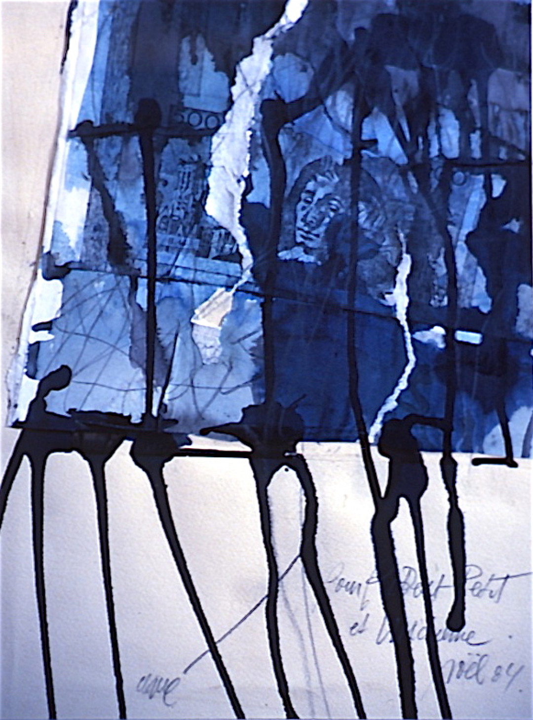 Il ne s’agit bien sûr pas de ça ici. Le panneau est long et étroit (moins d’un mètre de large), l’effet longiligne est accentué par la composition géométrique, construite sur un axe central composé de collages d’« hankos » monochromes et de longues coulures de peinture. Du fond noir et brun se dégagent ces collages tels une fenêtre encadrée de sombres meneaux. L’œuvre cependant est loin d’être obscure. Les tons subtils proches de ceux du brou de noix sont illuminés comme par enchantement par les modestes papiers déchirés et les projections de peinture blanche et rouge. L’alchimie de l’artiste transmute l’obscurité en un scintillement lumineux. Clavé achève son tableau le 1er janvier 1987. Il l’intitule « Bonne année ».