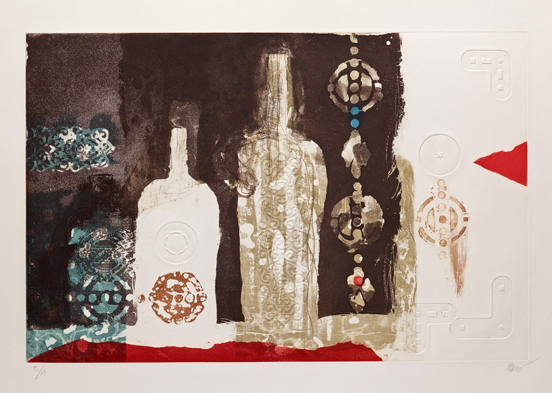 He discovers carborundum in 1968, shortly after Henri Goetz developed the technique, and this is a revelation to him. He adds matter and embossing to his engravings, which enriches his iconographic repertoire and is in line with his artisanal and experimental approach. Thanks to these techniques, he explores other materials and creates multiple prints in ingenious ways. He plays around and associates all sorts of materials to his etchings and aquatints: fabric, cardboard, wood, newspaper clippings, strings, keys, and later nails, bugs, screws, trombones and staples. The medium itself becomes an artwork: two printing plates are indeed shown to the public.