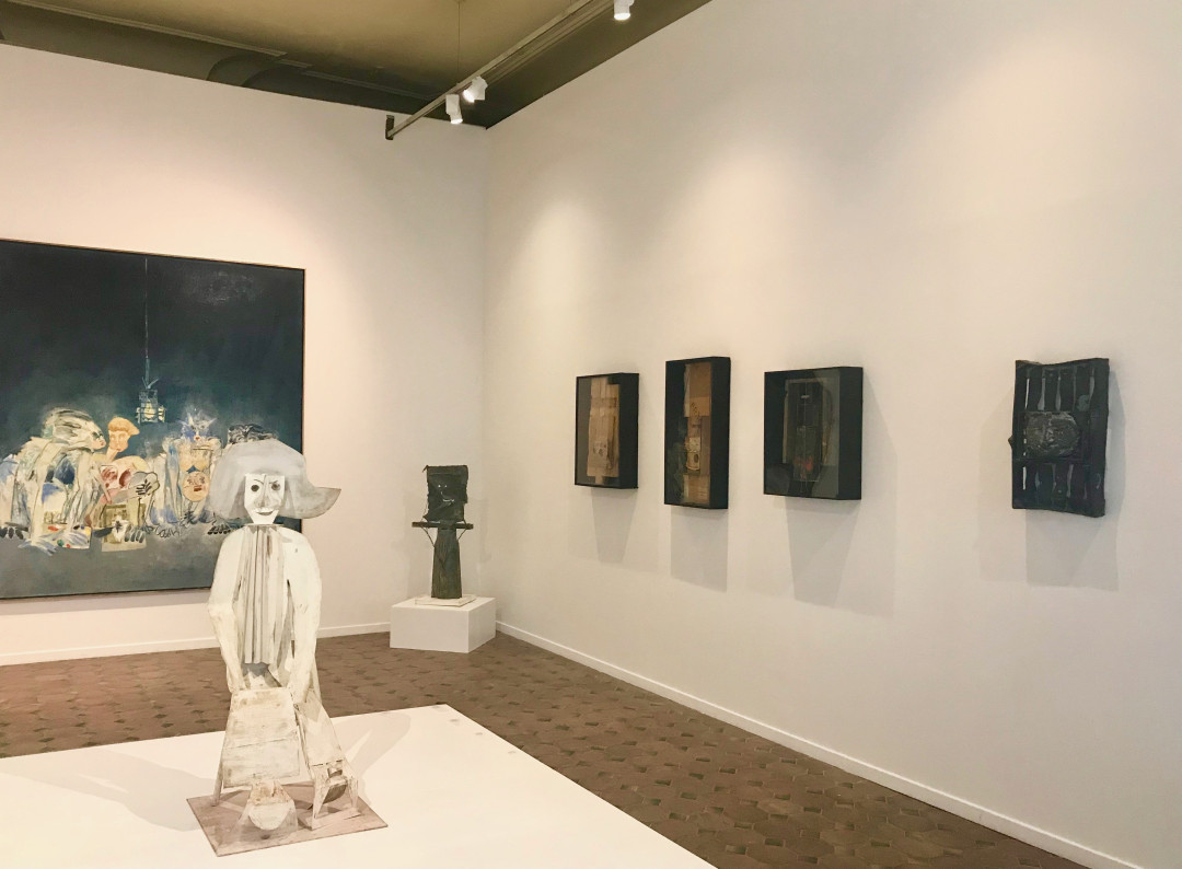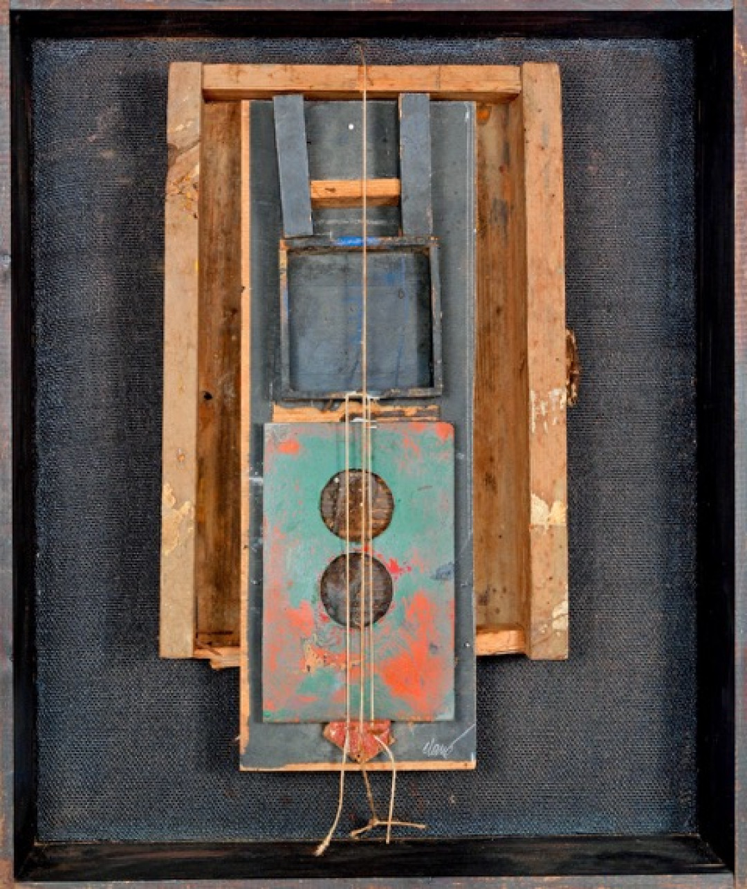 Five works by Clavé are shown: three “Instruments étranges” – Instrument en carton, Instrument muet and Etrange instrument (1962-1976) – and two sculptures, Masque au cageot (1963) and On dirait un guerrier (1985). The “Instruments”, because of their inner nature, tend to be closer to the sculptures created by Clavé. Clavé masters the art of assemblage, he likes accumulating various textures and transforming abandoned objects, which were dear to his illustrious predecessor. No one would be able to play with these three improbable instruments, made out of bits of cardboard, wood, drawer frames, boards, strings, staples and nails. Clavé is a poet, he plays around with poor materials, he twists them in order to rehabilitate them better. Made out of bronze, Masque au cageot (1963) is more of a traditional sculpture. But again, it is the result of assembled materials. A first small crate contains a round and flattened plaster mask; the small crate is then positioned into a big one, which shape has been altered by the weight of the vegetables it used to contain or because of the time it was left aside in the artist’s studio. One eye is closed while the other one is emptied. On dirait un Guerrier (1985) is a bronze sculpture representing a hieratic character, this soldier is being made out of two parts of a wooden board, a torn and old mop, iron wires and a few nails. The warrior is a recurrent form in Clavé’s oeuvre. It first appeared in his paintings in 1958 and in his sculptures in 1960. The first works broaching this theme were of small size rather, becoming bigger and bigger over time, and reaching a height of 3,8 meters in 1991.