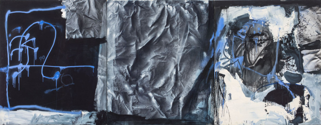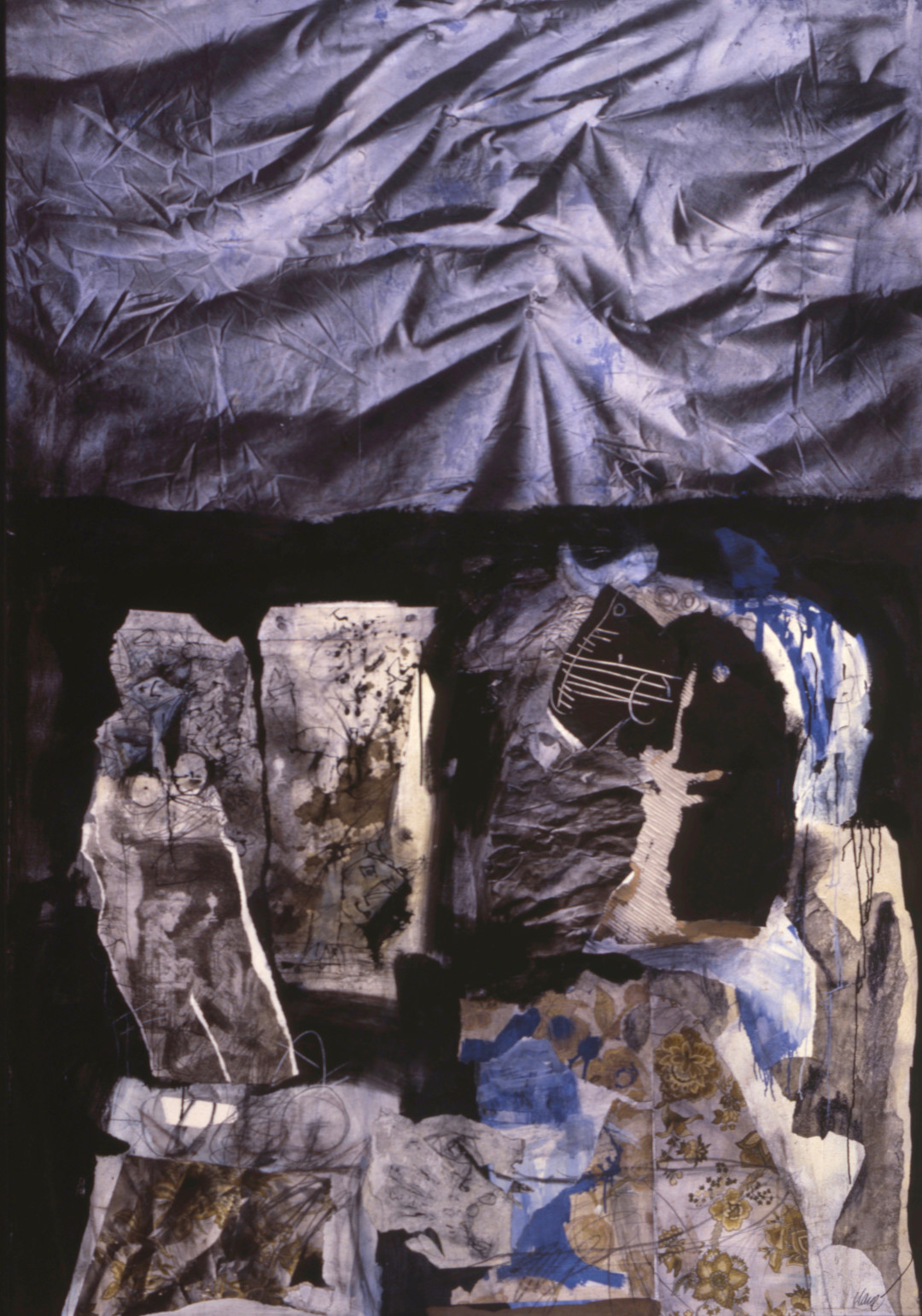 S’il n’y avait la bande noire premier plan, il s’agirait d’un format carré. Antoni Clavé nous invite d’emblée dans le monde de l’illusion : faux carré et faux tissus plissé. La moitié de la toile est composée en effet d’un vrai trompe l’œil : un « papier froissé » pour reprendre l’expression des historiens d’art pour désigner les trompe-l’œil que Clavé affectionne depuis la deuxième moitié des années 1970. Le registre supérieur est composé quant à lui de larges aplats de peintures, de coulures, de collages de vrais papiers déchirés et de parties laissées en réserve, le tout rehaussé de longues ficelles rouges et cordes brutes fixées par des punaises. Ces lignes horizontales situent l’œuvre dans la droite suite de la série de sculptures et de gravures « Instrument étranges » qui firent l’actualité de Clavé lors de son exposition au Centre Georges Pompidou en 1978. Cette horizontalité, reprise par les coulures noires prolongeant le motif central, suggère d’autant plus cette filiation que le spectateur peut y voir les lignes qui composent une portée. Les punaises, réelles ou figurées, les taches d’encre peuvent quant à elles proposer le début d’une mélodie.