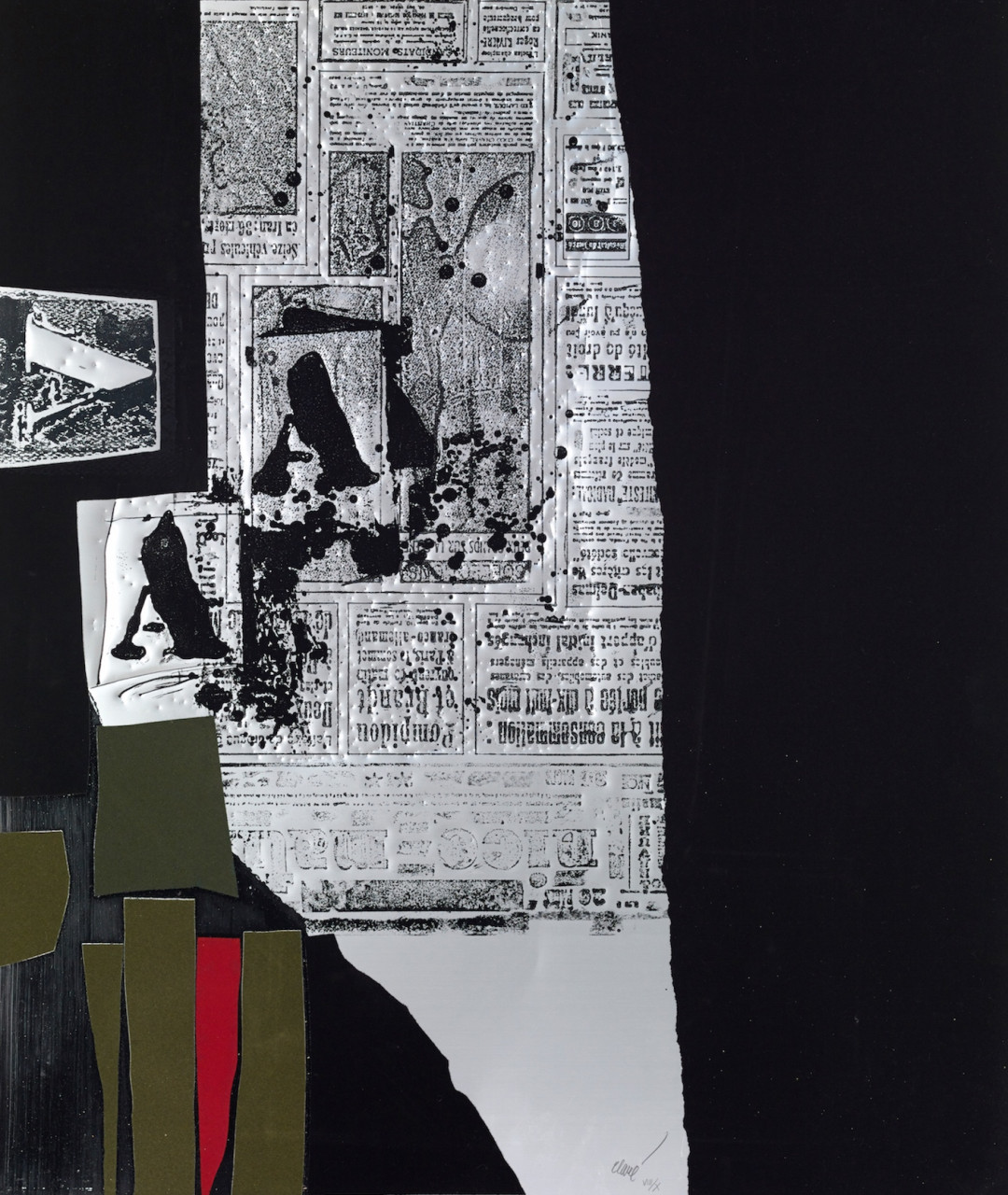 "Assembler et peindre, peindre et assembler, l'un poussant l'autre, parce qu'au fond, pour lui, c'est une seule et unique création. Le geste de découper, de déchirer, celui de coller, celui d'agencer et celui de manier le pinceau ou le crayon participent d'une même entreprise, qui ramasse telle chose vue, tel objet laissé pour compte, telle rencontre fugitive d'images. Il y a d'abord unité de création (...)." en 2001 Pierre Daix analyse parfaitement la démarche créatrice de son ami dans son livre Antoni Clavé Assemblages 1960-1999. La série de gravures sur feuilles d'aluminium dont fait partie C'était hier date de 1972. A cette époque Antoni Clavé multiplie les recherches, les approches et les expérimentations graphiques autour de l'assemblage de matières aussi insolites que variées. Il multiplie aussi les expérimentations techniques que lui offrent le gaufrage et le collage. Le feuillet métallique lui permet de jouer avec la surface : brossée, lissée, gaufrée voire trouée et accidentée. La couleur, argentée, noire, rouge ou verte, est limitée à l'essentiel.