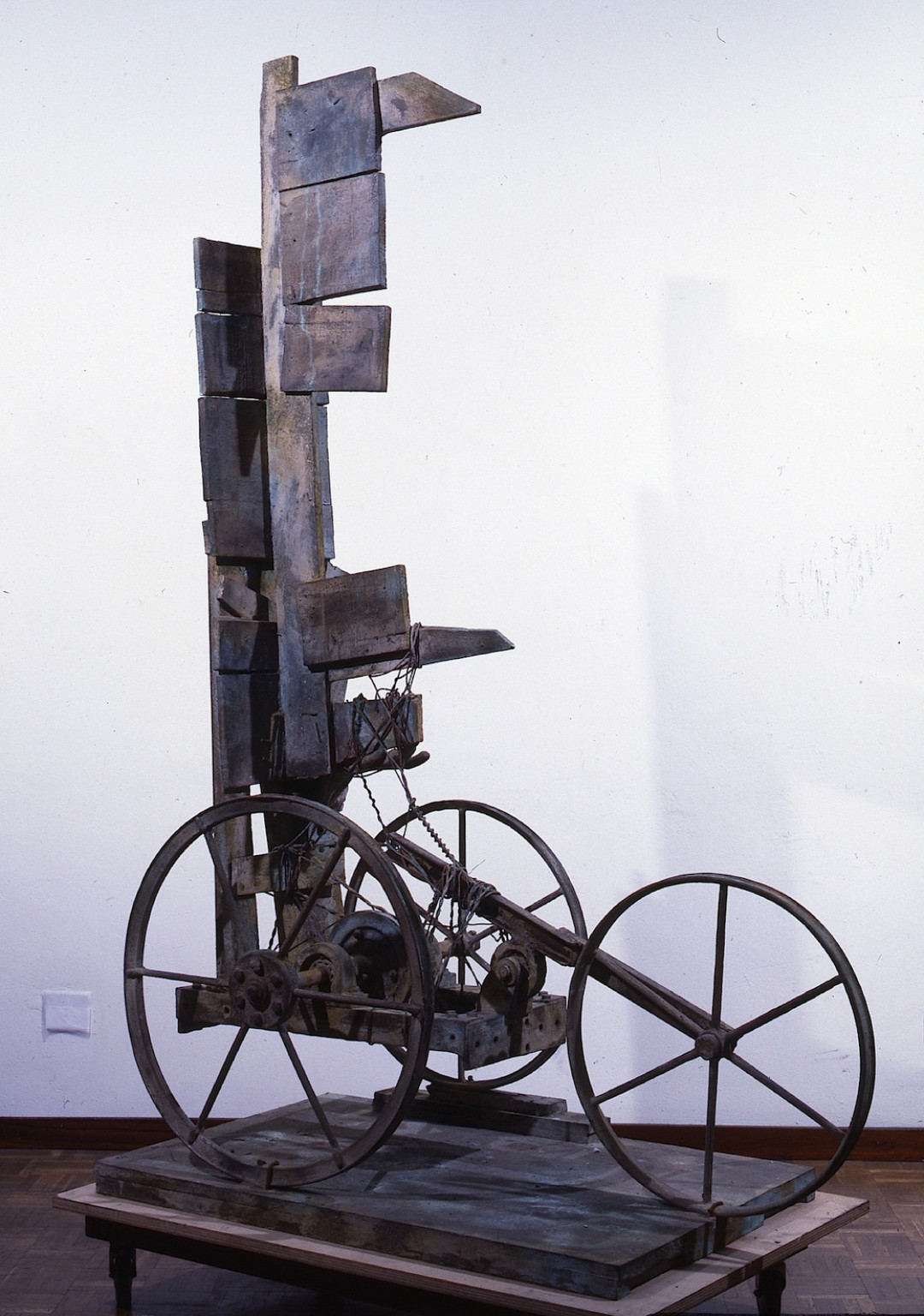 Antoni Clavé avait acheté un objet formé de trois roues et d’un engrenage puis l’avait laissé plusieurs années dans son jardin. L’objet fut altéré et rouillé par les intempéries puis Clavé le ramena dans son atelier pour lui donner une seconde vie. Il y ajouta plusieurs planches de pin d’Alep grossièrement clouées, ainsi qu’un gant de jardinage, le tout maintenu à l’objet roulant par des cordes, formant une sorte de personnage au-dessus d’un tricycle. Vu de côté un profil humain apparaît, bouche entrouverte, nez au vent. Cet assemblage est renforcé par plusieurs liens, la main gantée du personnage soigneusement ficelée à son véhicule. L’œuvre est contemporaine du guerrier attaché, hommage à Picasso : A Don Pablo. Toutes deux procèdent du même goût d’Antoni Clavé pour l’assemblage d’objets hétéroclites, de leur transformation en un nouveau langage plastique. Pourtant ici, aucune dimension solennelle ou grave. Au contraire, cette œuvre se distingue par son côté onirique léger et évoque d’avantage la silhouette dégingandée d’un Jacques Tati.