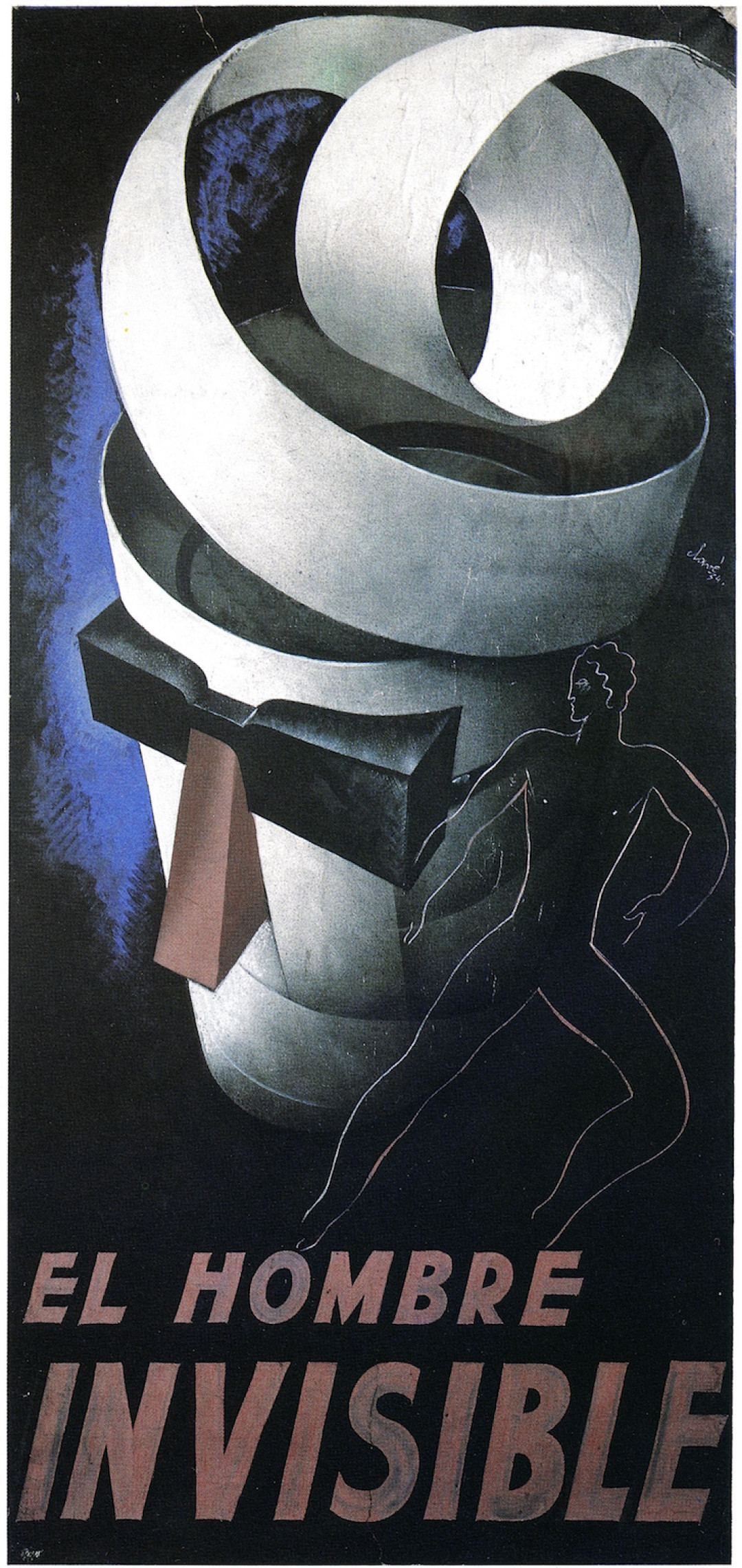 Le 13 novembre 1933 sortait aux Etats-Unis "The Invisible Man" adapté du roman de H. G. Wells par James Whales. C'est l'époque où les sorties en salles différaient énormément d'un pays à l'autre. Les affiches étaient alors peu ou pas distribuées. À Barcelone les gérants des salles de cinéma faisaient exécuter des affiches directement sur les parois vitrées des cinémas. Antoni Clavé a débuté ainsi sa carrière avec pour mission de donner envie aux passants d'aller découvrir le film.. L'affiche de Clavé date de 1934 et fut réalisée pour le cinéma Le Capitol pour la sortie de "The Invisible Man". L'œuvre de Clavé est dynamique et efficace : les lunettes noires et le bandage tourbillonnant suggèrent la folie terrifiante du scientifique. La silhouette à peine esquissée semble s'enfuir... Victime ou bourreau? Le destinée Jack Griffin était à découvrir dans les salles obscures! Cette affiche est présentée au public dans le parcours permanent du Musée National d'Art Catalan (MNAC) à Barcelone.