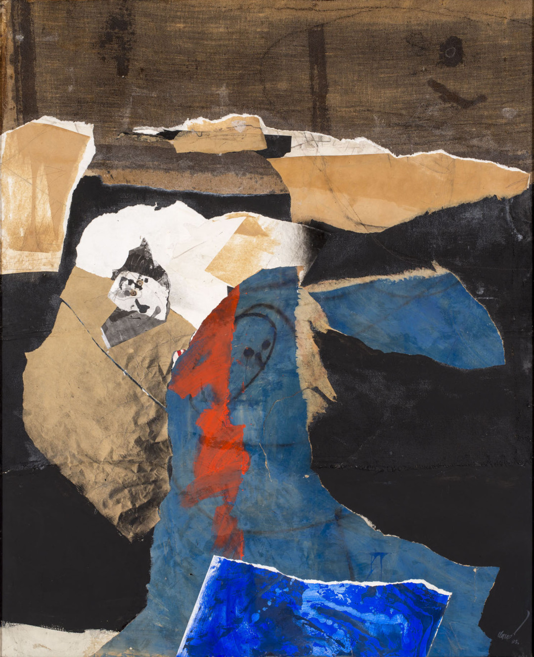Il faut dire que c'est tout l'univers de Clavé qu'on retrouve dans cette œuvre : la toile de jute presque brute accueille ce que l'artiste affectionne le plus : collages de papiers déchirés, trompe-l'œil, peinture, encre, fusain et aussi punaises! Les papiers déchirés de Clavé suivent la voie des papiers découpés de Matisse : ils ajoutent formes, couleurs et textures. Clavé aime les matières et leurs effets et offre ainsi sur cette toile des juxtapositions inattendues : collages, larges aplats de peinture, empilements de papiers finalement punaisés, trompe-l'œil. Le "condensé de Clavé" se poursuit dans la figuration, oui la figuration car ce sont bien des visages qui se révèlent aux spectateurs : tracé au centre, comme une évidence, en masque avec des punaises pour globes oculaires un peu plus à gauche, ou encore esquissé tel un cyclope gigantesque en haut à droite.
