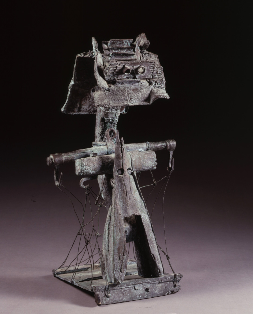 Cette figure guerrière est un assemblage d'objets de rebut : quatre grands bouts de bois, divers objets trouvés en métal, des fils de fer, des morceaux de toile et de carton déchirés. La fonte en bronze donne unité et puissance au personnage et lui confère son statut d'oeuvre d'art. Le combattant vaincu nous apparaît néanmoins en bien mauvaise posture: désarmé, corps étroit, jambes écartées et partie inférieure du corps attachée au socle par des fils de fer. Ces lignes apportent une tension dramatique à cette oeuvre composite. Le guerrier s'impose cependant par sa posture fière et sa tête colossale. Prisonnier de guerre, incarnation d'une certaine dignité, cette composition précède et annonce la sculpture hommage A Don Pablo qu'Antoni Clavé réalisera en 1986.