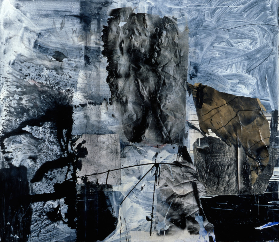 Aragon avait conçu et analysé la notion de défi des collages à la peinture à propos des papiers collés inventés par Braque et Picasso. Clavé a répondu à l'appel d'Aragon pendant quarante ans de création, depuis ses premières huiles et collages sur toile datant des années 1960 jusqu'à ses dernières oeuvres au début des années 2000. Il est en bas à gauche, tout comme Il revient caché, est un assemblage de matériaux et également une juxtaposition de techniques de création : papier collés, déchirés, rapportés, multiplication des techniques peintes. La composition offre une place de choix à des papiers collés de taille monumentale. Des pages imprimées déchirées, à l'envers, illisibles sont comme un sortilège magique, un secret d'alchimiste. Le regard du spectateur est ici encore invité dans un tourbillon intense. La palette d'Antoni Clavé s'est restreinte au cours de ses dernières années de création, concentrée autour du noir, du blanc, du bleu et du brun.