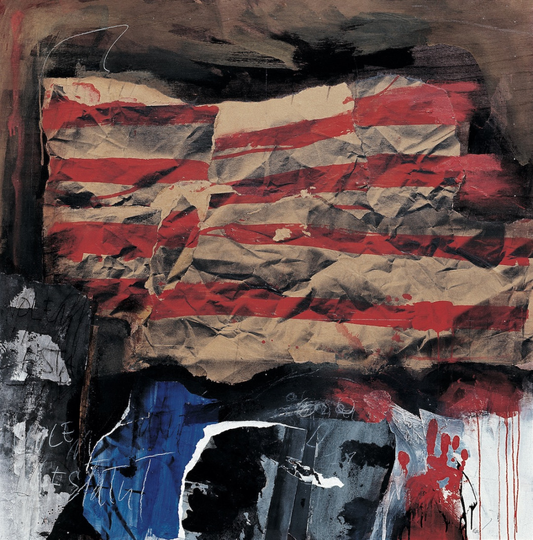 Le drapeau de la catalogne, appelé « la senyera », présente quatre bandes horizontales rouges sur fond or. C’est l’un des plus anciens drapeaux d’Europe dont l’origine remonterait au IXe siècle. Il est élaboré sur le blason des comtes de Barcelone. Il a été le drapeau officiel de la Catalogne dans les années 1930 et c’est donc en toute logique qu’il occupe la très grande majorité de l’espace de ce tableau de Clavé, comme s’il flottait au vent, lointain héritier du drapeau tricolore arboré par la République dans « la Liberté guidant le peuple » d’Eugène Delacroix. Il ne s’agit plus à proprement parler d’une scène de barricade mais, à regarder de plus près, le drapeau est composé de papier froissé, sali et déchiré, recollé pour être assemblé et s’offrir en support aux bandes de peinture rouges. Le rouge éclabousse, dégouline. Finalement un personnage au premier plan dont la main est une empreinte rouge sang désigne cet emblème. Quelques mots parachèvent la composition et donnent son titre au tableau « VOLEM L’ESTATUT ».