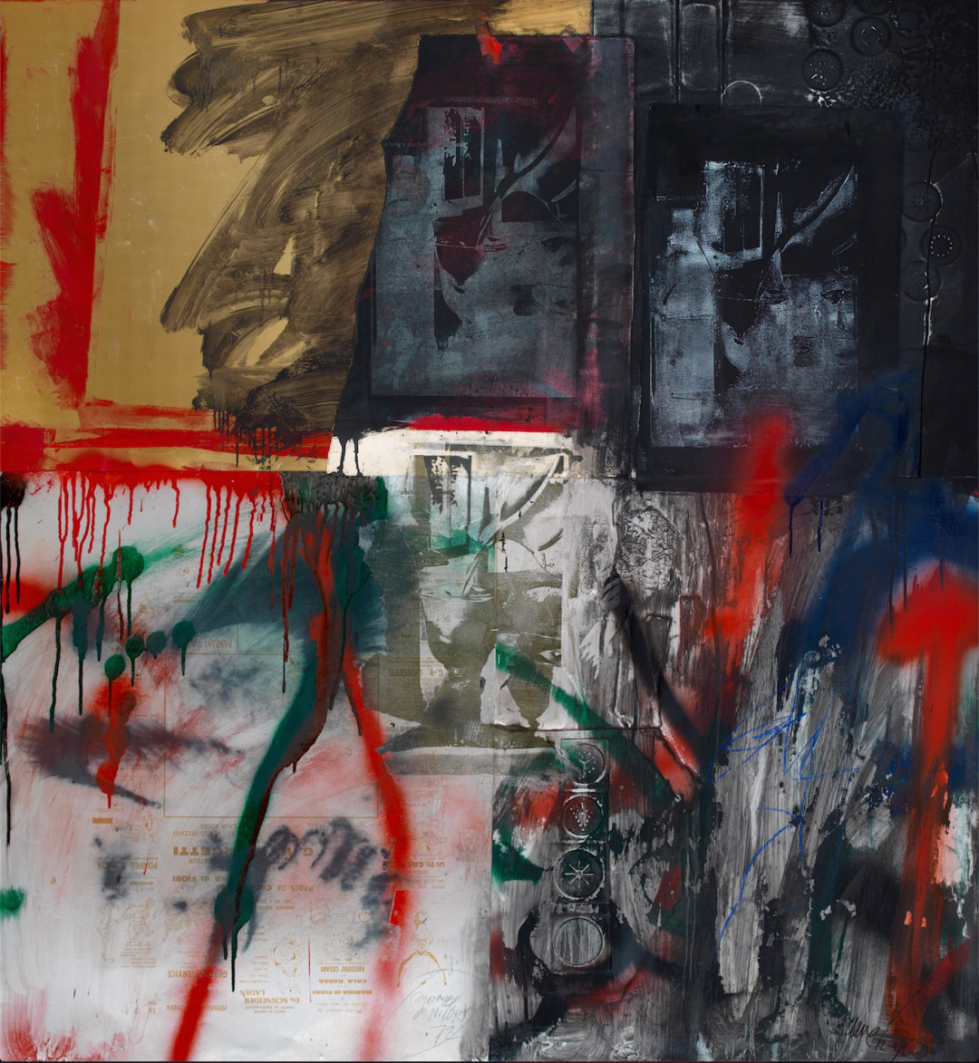 Vu à Vicky street a été créé en deux temps : en 1972 il commence cette œuvre et va jusqu'à la signer (en bas au centre de la composition). Il la reprend pourtant en 1990 après un second voyage à New York au cours duquel les graffitis vus dans les rues de la cité américaine le marquent profondément. La composition est plus intense, sa lecture plus complexe. Huile et aérosol se chevauchent et s'enchevêtrent. Ils introduisent les techniques mixtes (peinture et collage) et les compositions au rythme soutenu de la série "Vu à New York".